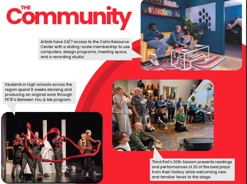 Community groups supported through CoHo Resource Center: - Bedrock Theatre - Beens & Co. - Beirut Wedding Project - Clownbloc - Corrib Theatre - Crave Theatre - From the Ground Up - Genderbomb PDX - Movement for Peoples’ Unity - NW Theatre Workshop - Theatre Diaspora - & more than 40 individual artists